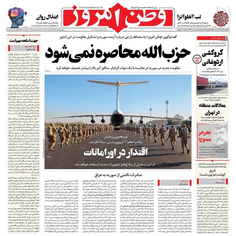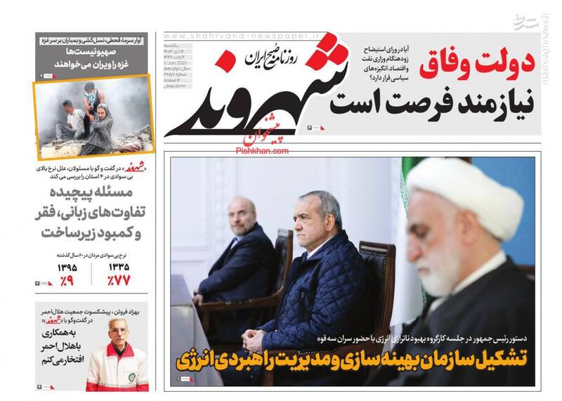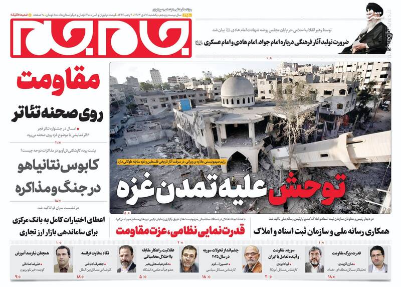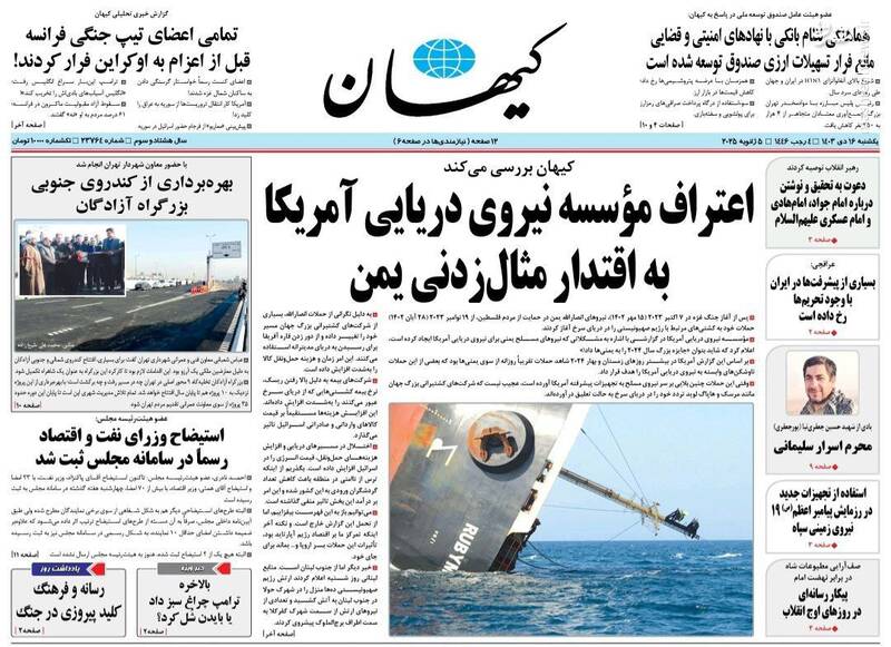 کبنا ؛اعتراف مؤسسه نیروی دریایی آمریکا به اقتدار مثالزدنی یمن، دیکته اقتدار دفاعی به دشمن در رزمایش ۱۹ سپاه، توحش علیه تمدن غزه، تیتر برخی از روزنامههای یکشنبه ۱۶ دی ماه ۱۴۰۳ است.