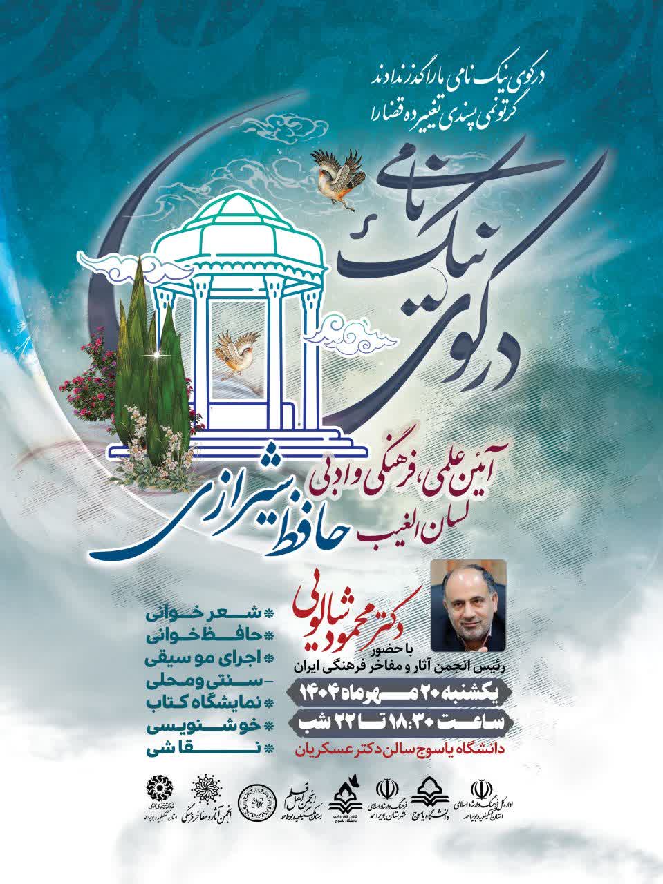 به گزارش کبنا نیوز، آئین علمی، فرهنگی و ادبی حافظ شیرازی شامگاه یکشنبه ۲۰ مهرماه ۱۴۰۴ در سالن اجتماعات دانشگاه یاسوج با حضور محمود شالویی، رئیس انجمن آثار و مفاخر فرهنگی ایران، مهدی نوری، رئیس دانشگاه یاسوج، امین درخشان، مدیرکل فرهنگ و ارشاد اسلامی استان کهگیلویه و بویراحمد و جمعی از مسئولان استانی و شهرستانی برگزار شد.