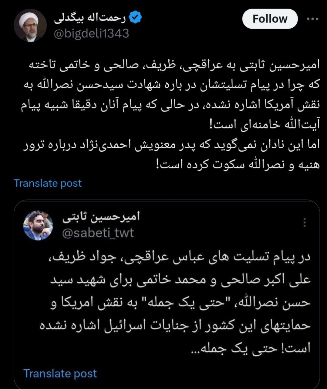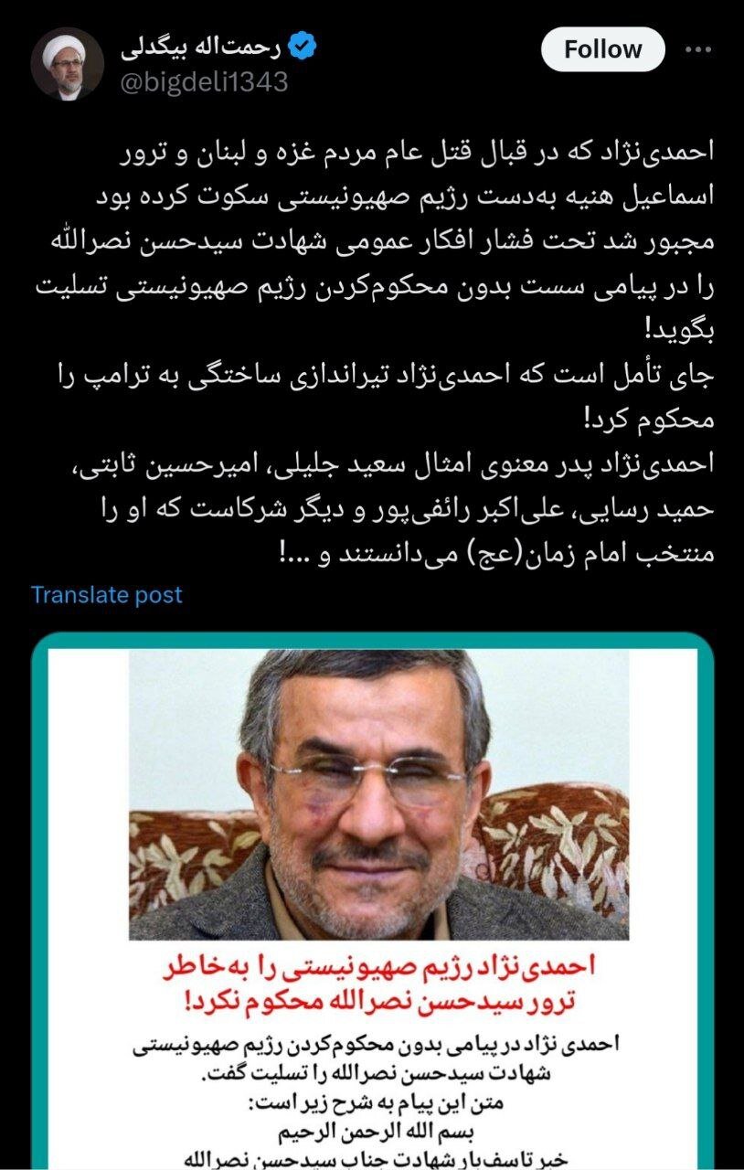 فعال سیاسی اصلاح طلب نوشت: احمدینژاد مجبور شد تحت فشار افکار عمومی شهادت سیدحسن نصرالله را در پیامی سست بدون محکومکردن رژیم صهیونیستی تسلیت بگوید.