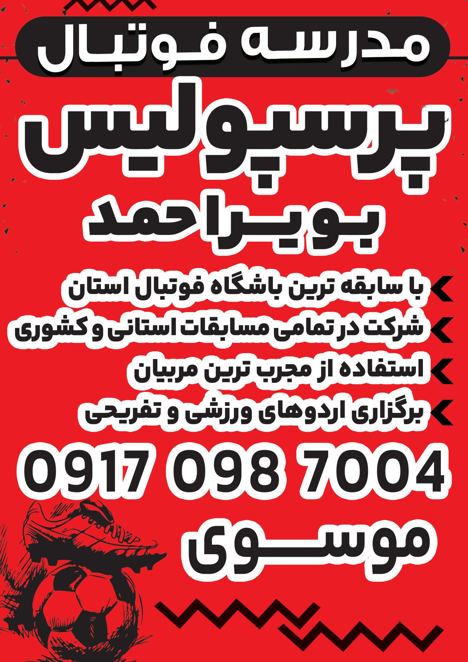 متقاضیان شرکت در مدرسه فوتبال باشگاه فرهنگی، ورزشی پرسپولیس بویراحمد میتوانند در تمام روزهای هفته از ساعت 9 صبح الی 9 شب با شماره 09170987004 (موسوی) تماس و نسبت به ثبت نام اقدام کنند.